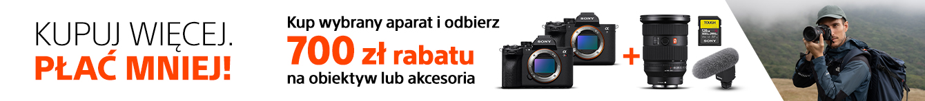 Podczas zakupu aparatu Sony ILCE-7M5 lub ILCE-7RM5 możesz otrzymać 700 zł rabatu na zakup obiektywu Full Frame lub wybranych akcesoriów fotograficznych znajdujących się w tej kategorii .