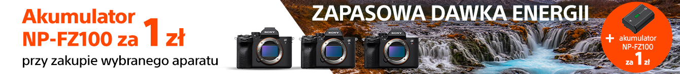 Przy zakupie wybranych aparatów Kupujący może zakupić jeden egzemplarz akumulatora Sony NP-FZ100 za 1 zł. Dodaj do koszyka jeden z aparatów z poniższej listy oraz akumulator a cena baterii automatycznie obniży się w koszyku do 1 zł.