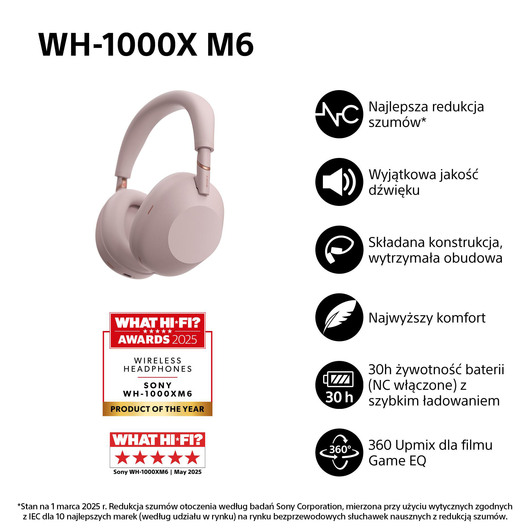 Słuchawki Sony WH-1000XM6 zostały opracowane we współpracy z nagrodzonymi Grammy® inżynierami masteringu. Wyposażono je w specjalnie zaprojektowany 30-milimetrowy przetwornik zapewniający zrównoważony dźwięk na wszystkich częstotliwościach oraz zaawansowany procesor HD QN3, z przewidującym układem redukcji szumów Look-Ahead, zapewniającym precyzyjną i dynamiczną reprodukcję dźwięku.